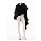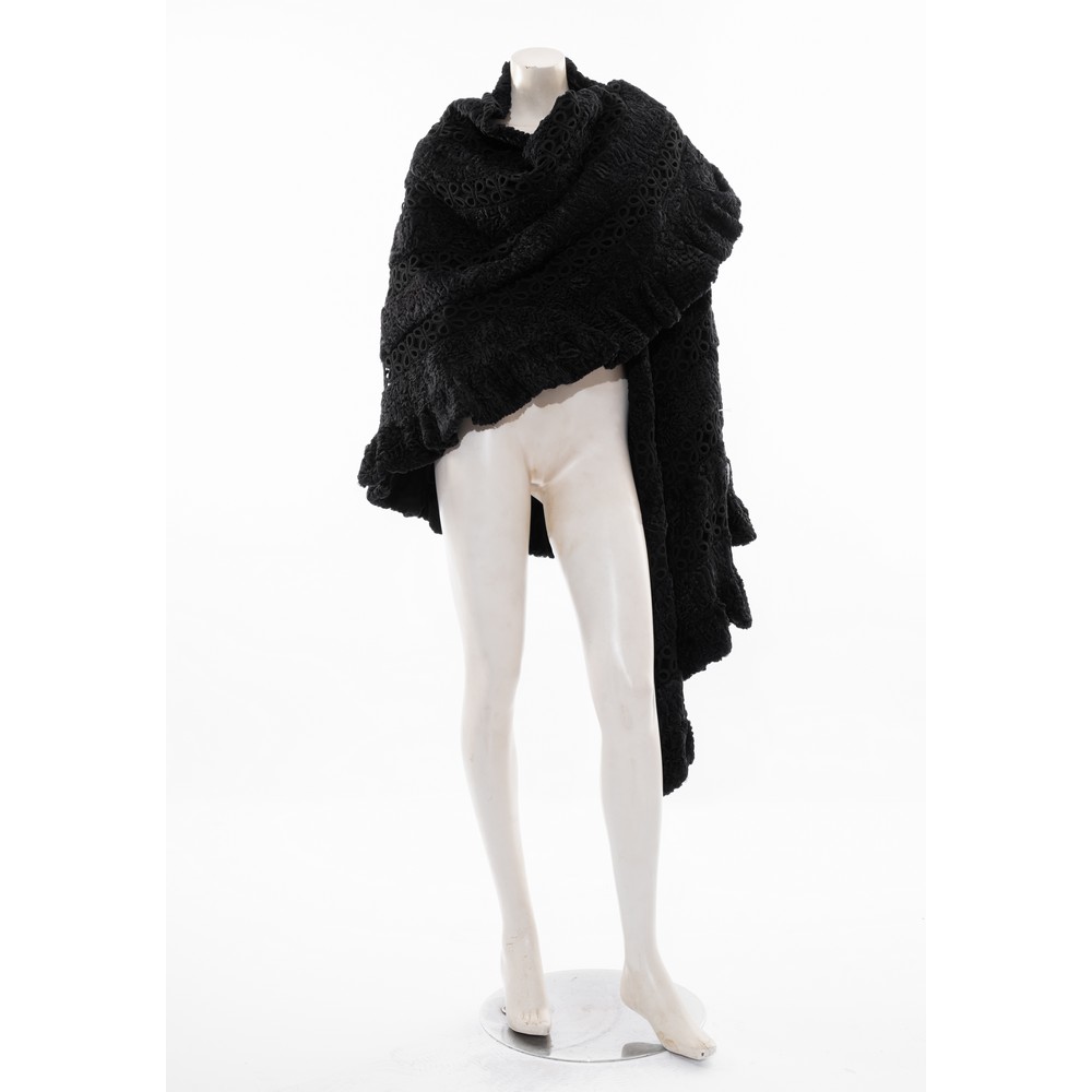 Mantella in pelliccia di Breitschwanz nero con lavorazione a fasce alterne in trina di lana nera, bordura lavorata con ruches. Taglia unica. Marchio di produzione.