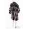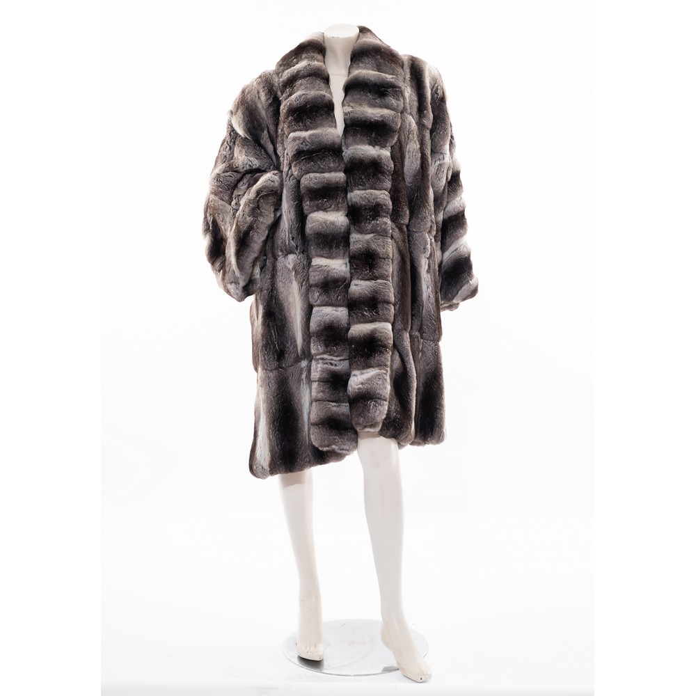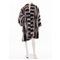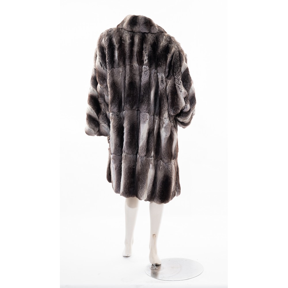 Cappotto in pelliccia di animale di allevamento, lavorazione a pelli intere verticali, ampio collo sciallato a pelli orizzontali e rivoltato fino all’orlo, ampia manica con lavorazione diagonale. Tagli L.
