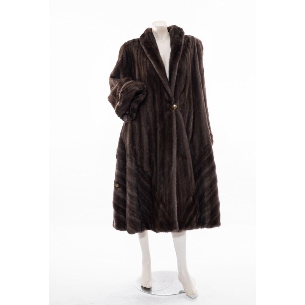 Cappotto in pelliccia di visone grigio zaffiro, lavorazione a pelli intere verticali e a spina di pesce sulla fascia inferiore, ampio collo sciallato, chiusura frontale con bottone gioiello, bottoni laterali, polsi ampi. Taglia L.