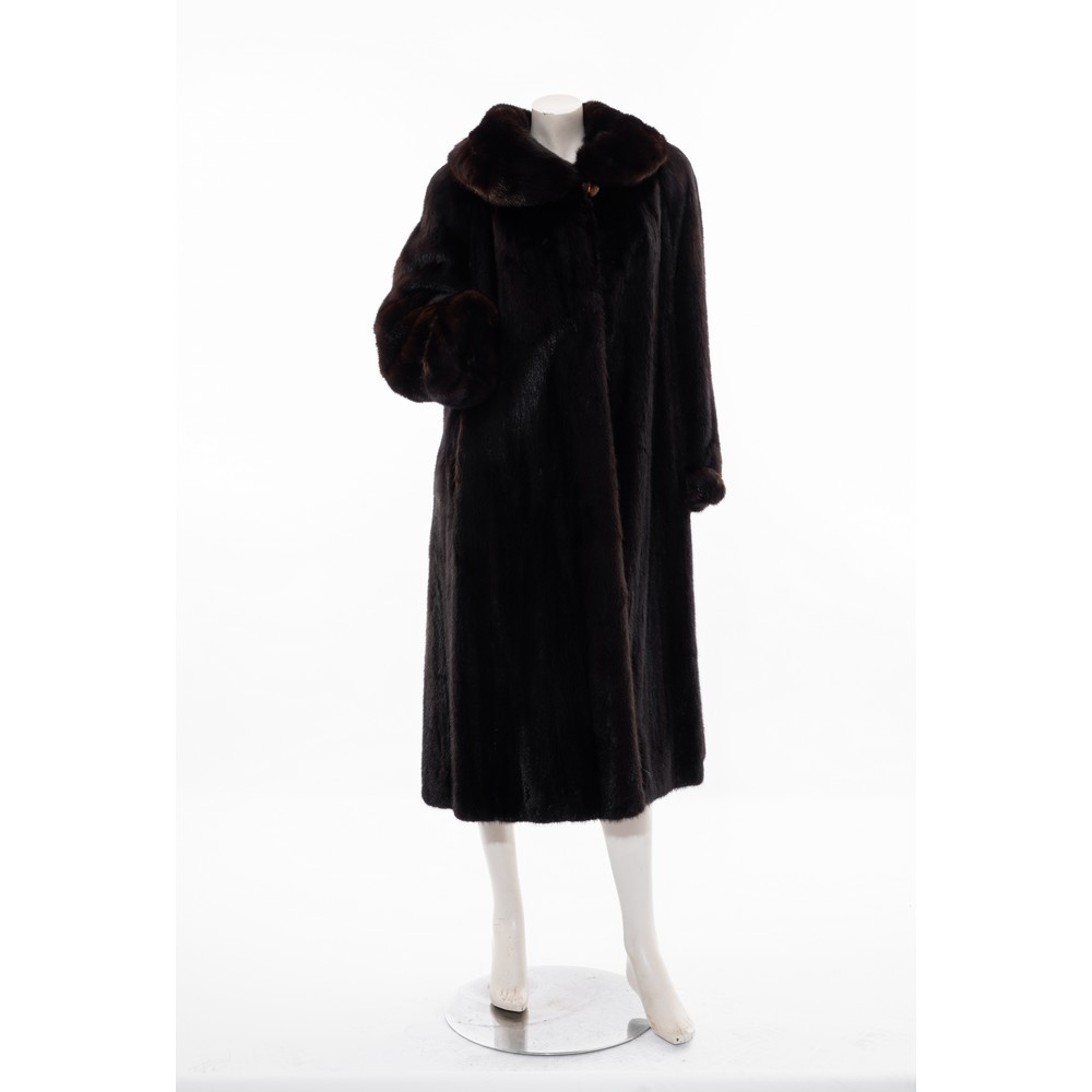 Cappotto in pelliccia di visone blackglama, lavorazione a pelli intere verticali, ampio collo, chiusura frontale con ganci e bottone gioiello al collo, polsi con lavorazione orizzontale. Taglia L.