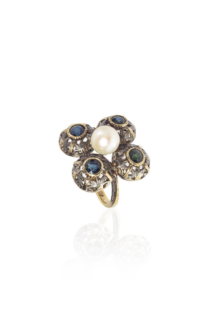 in oro giallo a bassa caratura ed argento, XX secolo, sommità a quadrifoglio, con perla giapponese del diam. di mm 7,5; zaffiri taglio rotondo per totali ct 1,0 ca.