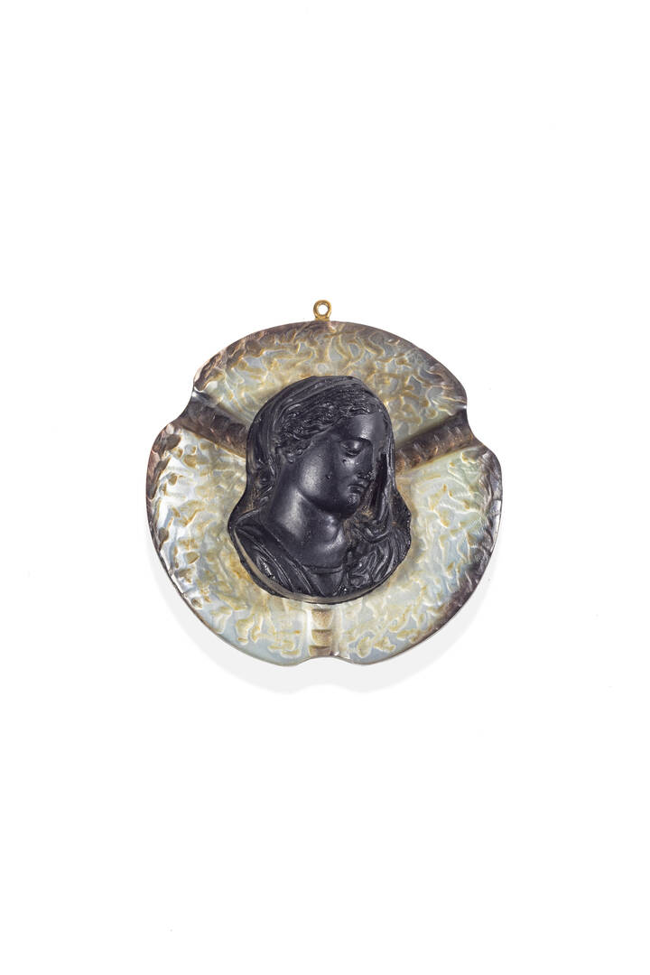 composto da disco in madreperla incisa; al centro figura femminile in giaietto (piccolo difetto sul naso). Gancio in oro giallo.