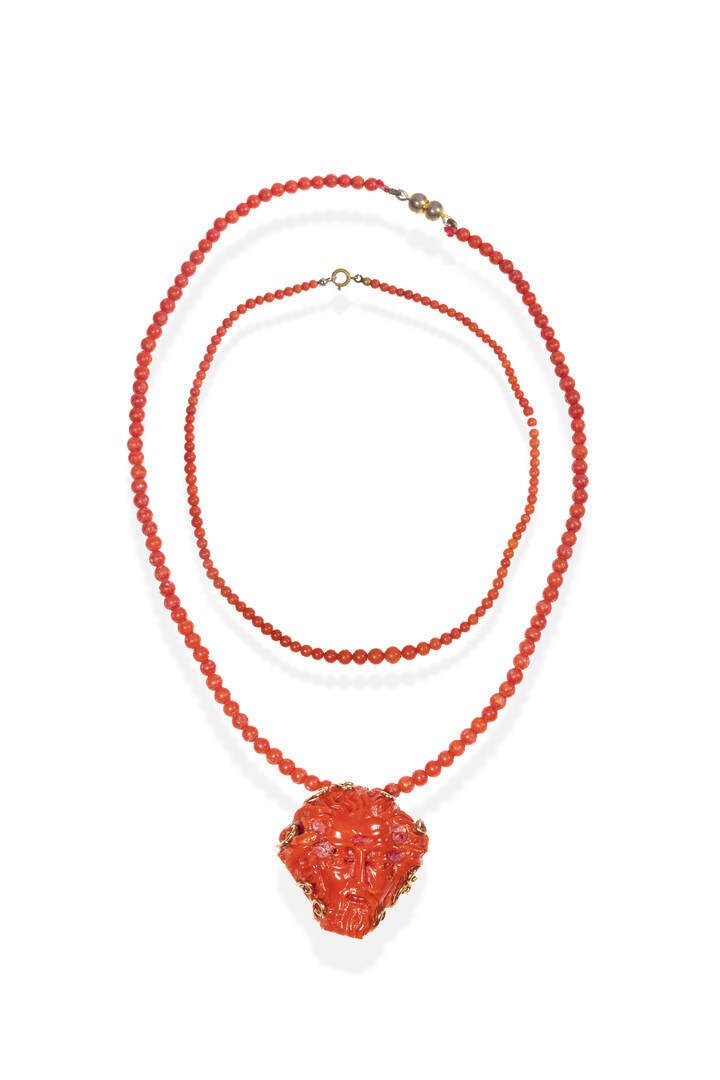 -girocollo con sfere di corallo rosso mediterraneo del diam. di mm 4,4; decorato con ciondolo raffigurante volto maschile. Chiusura in metallo. Peso gr 39,9. Lunghezza cm 40