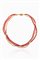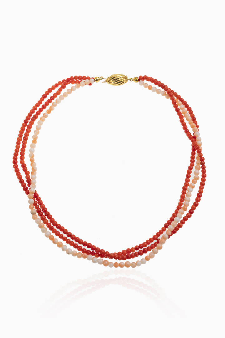 composto da due fili di sfere di corallo rosso mediterraneo e un filo di corallo rosa dal diam. di mm da 3,5 a 4. Chiusura a barilotto fesonato in oro giallo