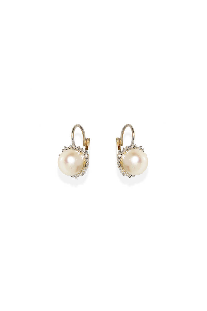 in oro bianco, a monachella, con due perle giapponesi del diam. di mm 7,4 ca