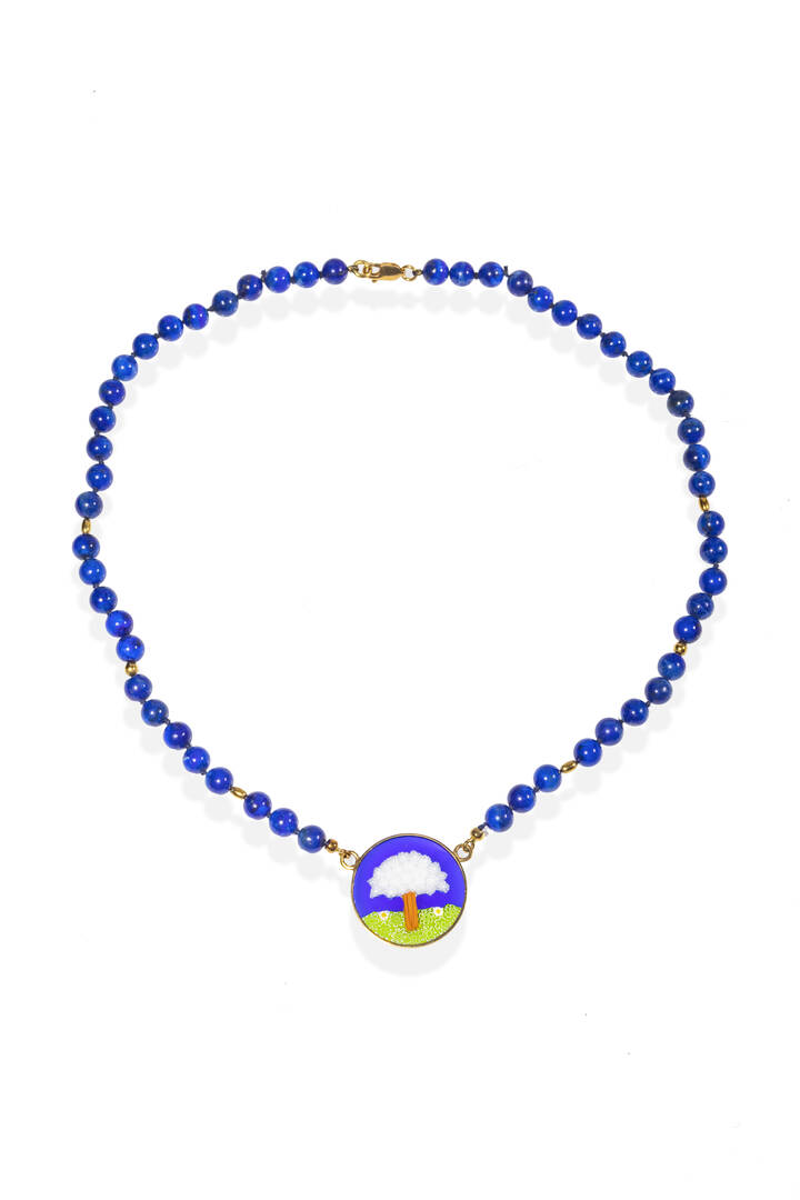 composta da sfere di lapislazzuli del diam. di mm 6 ca. Al centro inserto in murrina con struttura in oro. Chiusura e distanziali in oro giallo