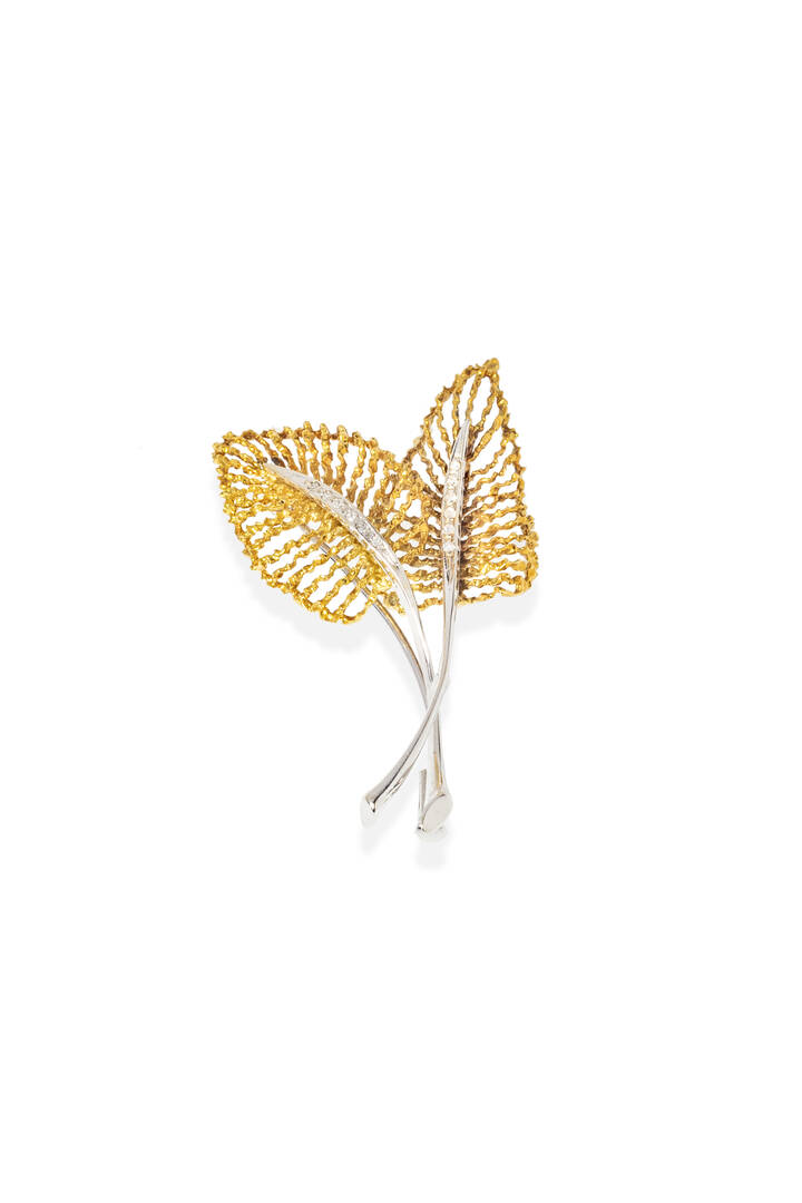 in oro giallo e bianco, anni '50, composta da due foglie traforate e lavorate a corda; impreziosite da diamanti taglio 8/8 per totali ct 0,13 ca