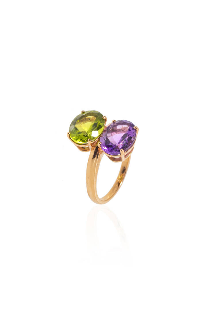 in oro rosa, sommità con un peridoto di ct 2,49 ed un'ametista di ct 2,38 taglio ovale