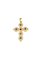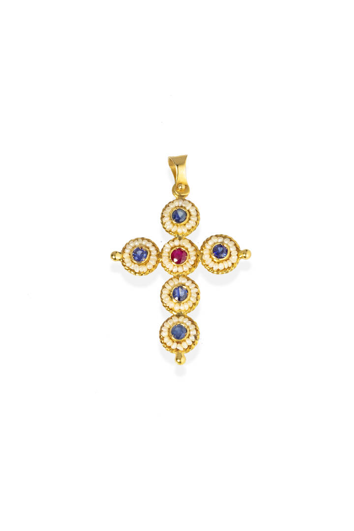 in oro giallo, in stile borbonico, a forma di croce, con perline a decoro; zaffiri e rubini taglio rotondo