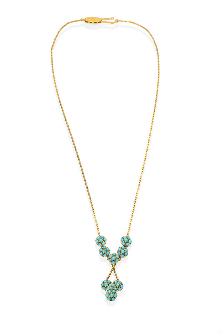 in oro giallo, a maglia veneziani, al centro otto fiori con turchesi cabochon.