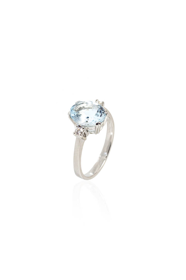 in oro bianco, al entro acquamarina taglio ovale di ct 2,04 ed ai lati due diamanti taglio brillante per totali ct 0,11 probabile colore G-H, purezza IF-VVS
