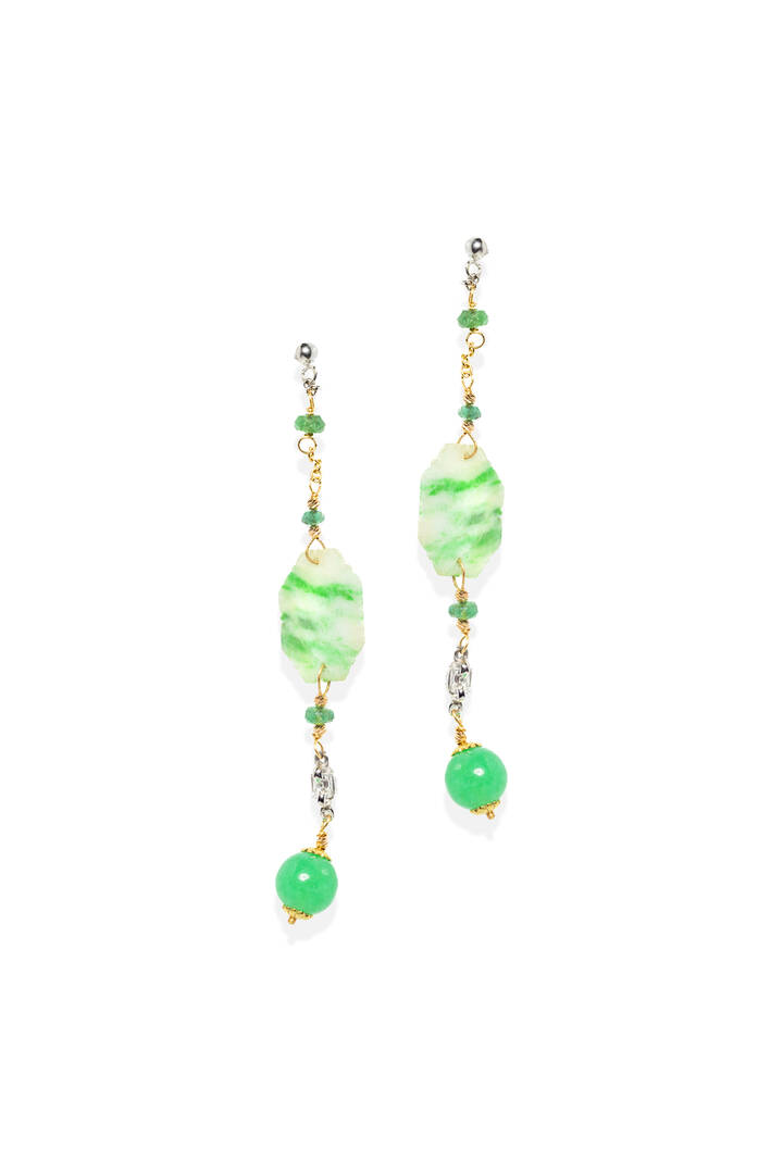 in oro giallo e bianco, con dischi in giadeite, sfere in smeraldi taglio briolette. sfere in agata verde. Diamanti taglio carré per totali ct 0,15 ca