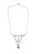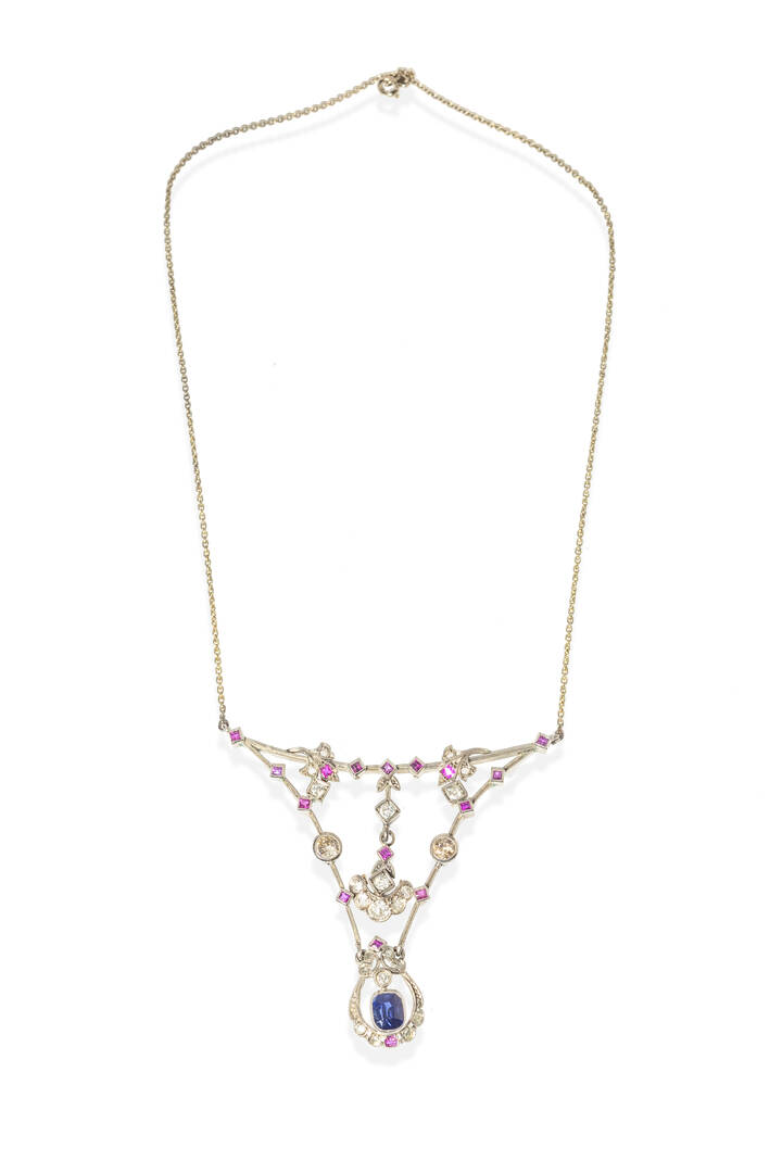 in oro bianco, anni '20, al centro segmenti rigidi da cui dipartono festoni con piccoli rubini; rosette e diamanti di vecchio taglio per totali ct 0,65 ca ed uno zaffiro taglio ovale non trattato di ct 0,70 ca.