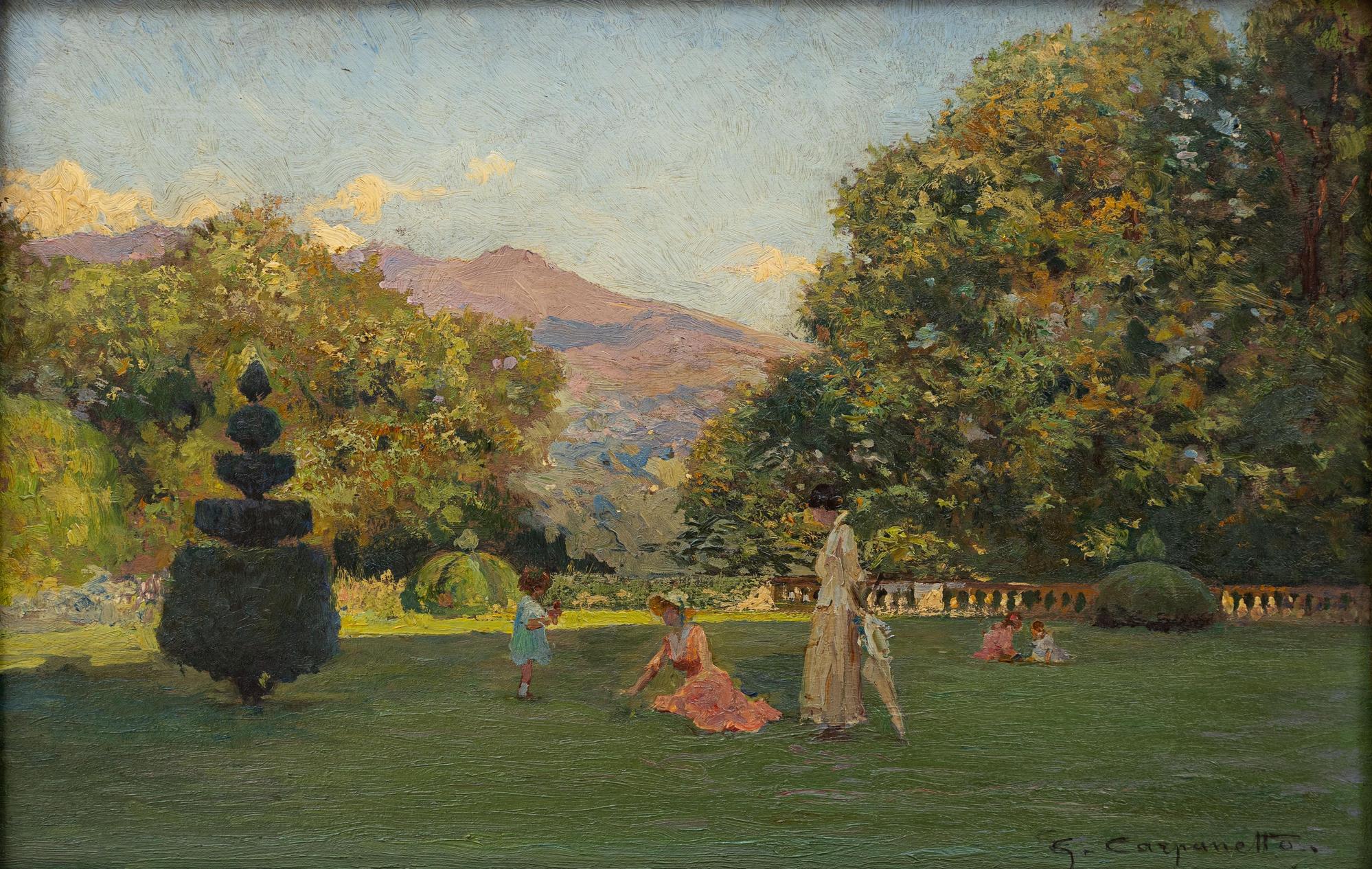 - Giovanni Battista Carpanetto nacque a Torino il 30 settembre 1863. Fin da giovanissimo mostrò inclinazione per la pittura e, dopo aver studiato all’Accademia Albertina sotto maestros rigorosi, esordì ufficialmente nel 1881 con una tela storica che segnò l’inizio di un’attività artistica intensa. Inizialmente attivo nel genere storico, su consiglio del pittore Marco Calderini egli abbracciò ben presto la pittura “dal vero”, muovendosi verso paesaggi, figure e ambienti caratterizzati da immediata leggibilità, viva sensibilità emotiva e talvolta da un accento narrativo o simbolista. Durante il suo percorso partecipò a mostre prestigiose, come la Nazionale di Venezia del 1887, dove presentò un’opera che suscitò polemiche: dimostrazione della sua capacità di provocare attenzione.Con il passare degli anni Carpanetto estese il suo raggio d’azione alla grafica pubblicitaria e all’illustrazione, realizzando manifesti per importanti aziende e occupandosi di illustrazioni di riviste: questa doppia carriera testimonia una sua versatilità tra pittura “alta” e applicazioni pratiche dell’arte. La sua produzione, basata su oli e pastelli, si distingue per la raffigurazione di figure inserite in paesaggi e per l’attenzione alla luce, alla rappresentazione del vero e alla narrazione visiva. Verso la fine della sua vita la partecipazione espositiva si ridusse e egli si concentrò sull’insegnamento e sulla grafica. Morì a Torino il 26 luglio 1928, lasciando un corpus che riflette le tensioni e le evoluzioni della pittura piemontese tra Otto e Novecento.