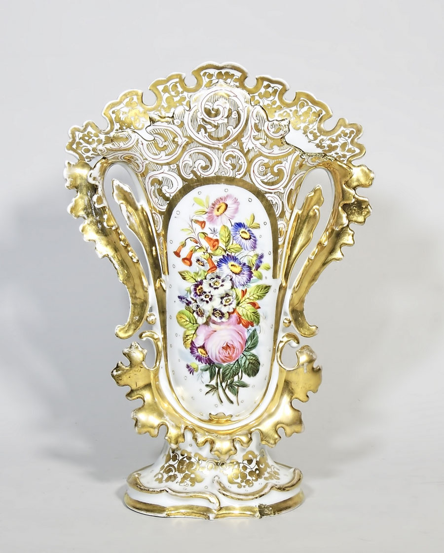 VASO A TROMBA IN PORCELLANA POLICROMA Francia, XIX secolo dipinto con motivi floreali e girali dorati h cm 38 PAINTED PORCELAIN VASE, FRANCE, 19TH CENTURY