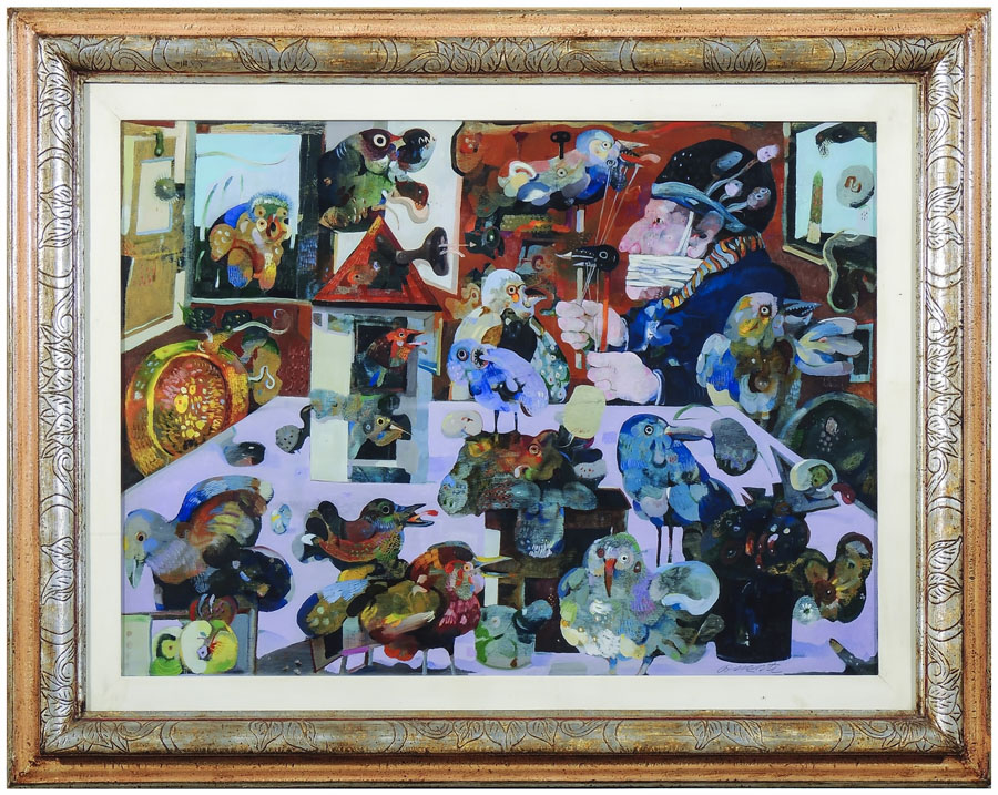 ANTONIO POSSENTI Allevamento di uccelli canori olio su tavoletta, firmato, al verso firmato e titolato, in cornice cm 60x80 BREEDING OF SINGING BIRDS, OIL ON PANEL