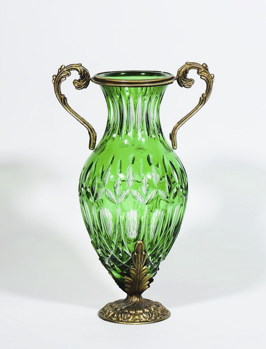 VASO BIANSATO IN CRISTALLO COLOR VERDE rilegato in metallo dorato h cm 35 GREEN CRYSTAL VASE