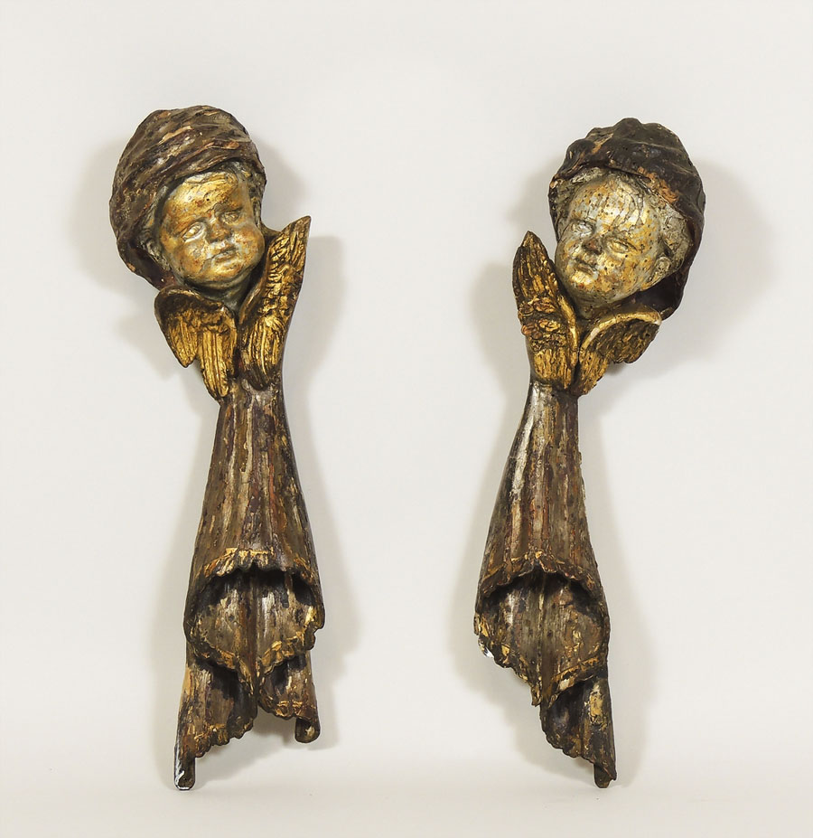 COPPIA DI FRAMMENTI IN LEGNO INTAGLIATO E DORATO raffiguranti puttini alati,...