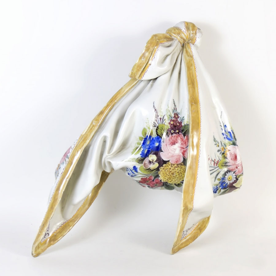 PORTAFIORI PENSILE IN CERAMICA POLICROMA Bassano, Le Nove, inizio del XX secolo realizzato come un fazzoletto annodato, dipinto con motivi floreali nei toni del giallo, rosa, blu e verde, difetti h cm 44 PAINTED CERAMIC FLOWER VASE, BASSANO