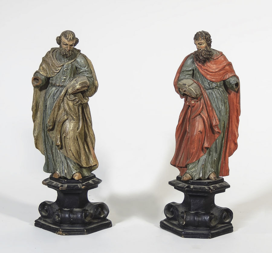 COPPIA DI SANTI IN LEGNO INTAGLIATO E DIPINTO Alto Veneto, XIX secolo su base sagomata in legno ebanizzato, alcune mancanze h cm 25 PAIR OF CARVED AND PAINTED WOODEN FIGURES OF SAINTS, NORTHERN VENETO, 19TH CENTURY