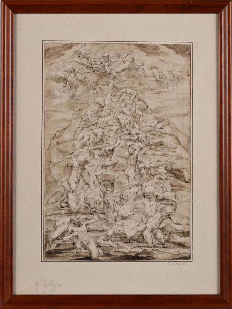 Caduta dei Giganti Inchiostro e acquerello su carta mm 300x200 - in cornice cm 42x32 Iscritto G. Golzio in basso a sinistra