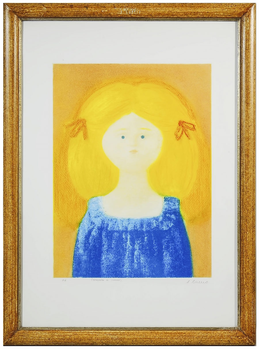 ANTONIO BUENO (1918-1984) Ritratto di fanciulla acquatinta ritoccata a mano, prova d'autore, firmata, in cornice cm 48x36 PORTRAIT OF A GIRL, HAND- COLOURED AQUATINT PRINT