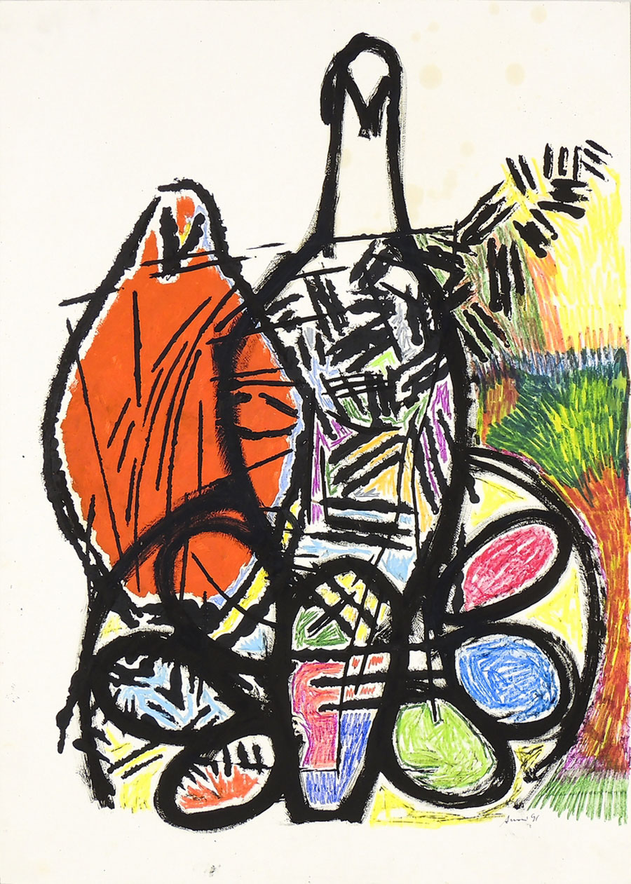 GIULIANO AZZONI (1953-2011) Composizione con volatili 1991 tecnica mista su cartoncino, firmato e datato, lievi difetti cm 100x70 COMPOSITION WITH BIRDS MIXED MEDIA
