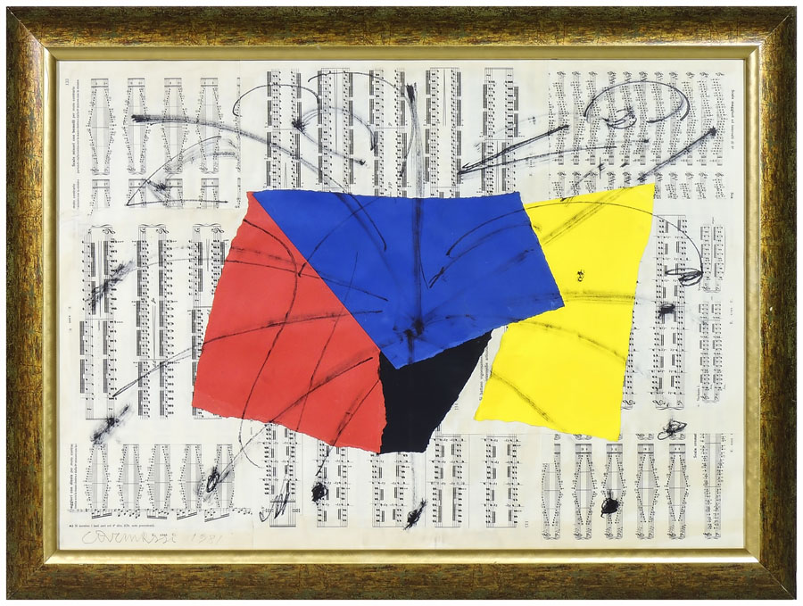 ARTURO CARMASSI Composizione con spartiti musicali 1981 collage e tecnica su carta, firmato e datato, in cornice cm 50x70 Corredato di autentica dell'autore su fotografia COMPOSITION WITH SHEETS MUSIC, COLLAGE AND MIXED MEDIA ON PAPER, WITH AUTHOR'S AUTHETICATION ON PHOTO