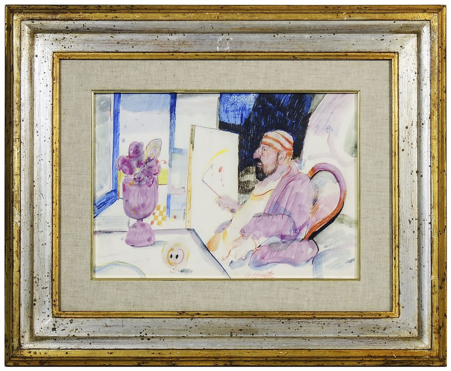 ANTONIO POSSENTI Veduta d'interno con autoritratto tecnica mista su cartone, firmato, in cornice cm 24,5x35 Corredato di autentica dell'autore su fotografia INTERIOR VIEW WITH SELF PORTRAIT, MIXED MEDIA ON CARDBOARD, WITH AUTHOR'S AUTHENTICATION ON PHOTO