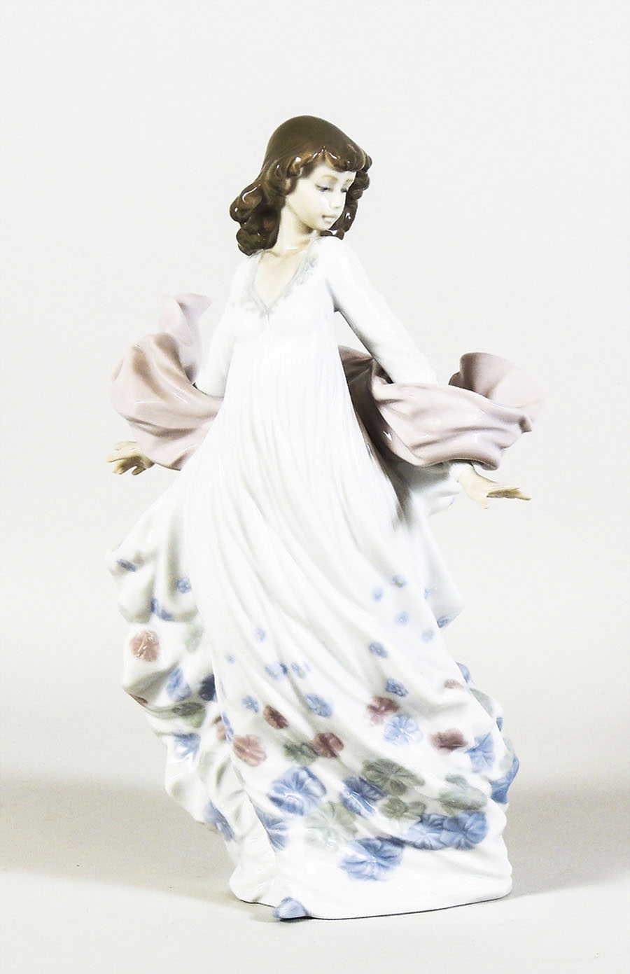 FIGURA IN PORCELLANA POLICROMA Lladró raffigurante una fanciulla con ampi panneggi h cm 30 PAINTED PORCELAIN FIGURE, LLADRÓ