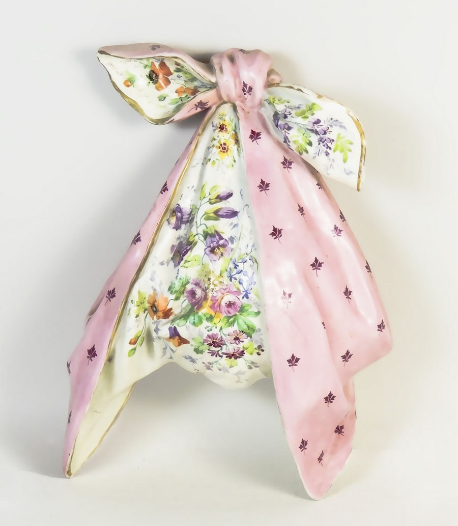PORTAFIORI PENSILE IN CERAMICA POLICROMA Bassano, Le Nove, inizio del XX secolo realizzato come un fazzoletto annodato, dipinto con motivi floreali nei toni del rosa e del viola, difetti h cm 38 PAINTED CERAMIC FLOWER VASE, BASSANO, LE NOVE, EARLY 20TH CENTURY