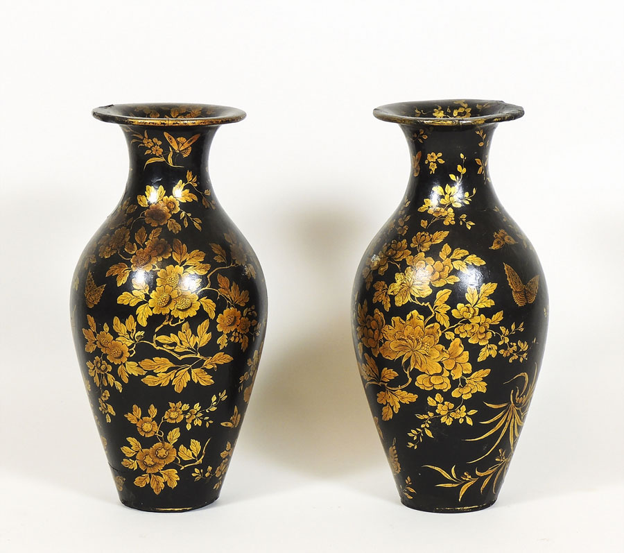 COPPIA DI VASI IN CARTAPESTA LACCATA fine del XIX/inizio del XX secolo dipinti in oro con motivi floreali e farfalle su fondo nero, alcuni difetti h cm 37 PAIR OF LACQUERED PAPIER-MÂCHÉ VASES, LATE 19TH/EARLY 20TH CENTURY