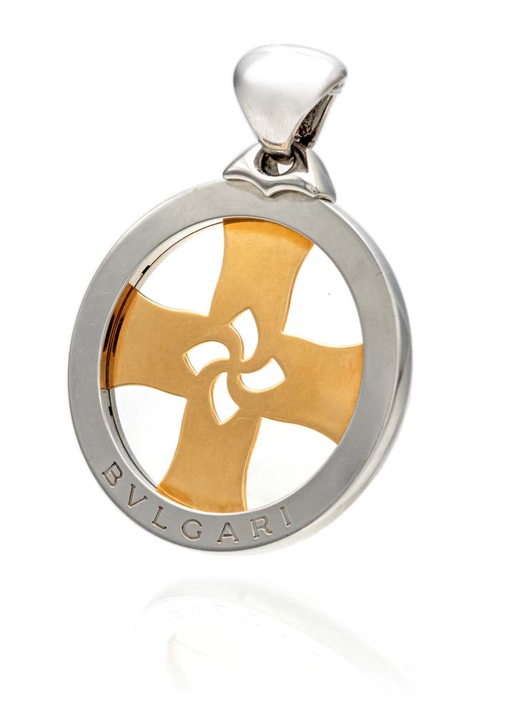 Bulgari, pendente croce in oro e acciaio Oro rosa 750/000, acciaio. Diametro mm. 45