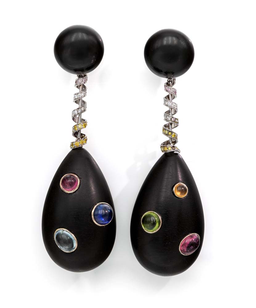 Coppia di orecchini pendenti in oro, ebano, brillanti, quarzi e tormaline Oro...