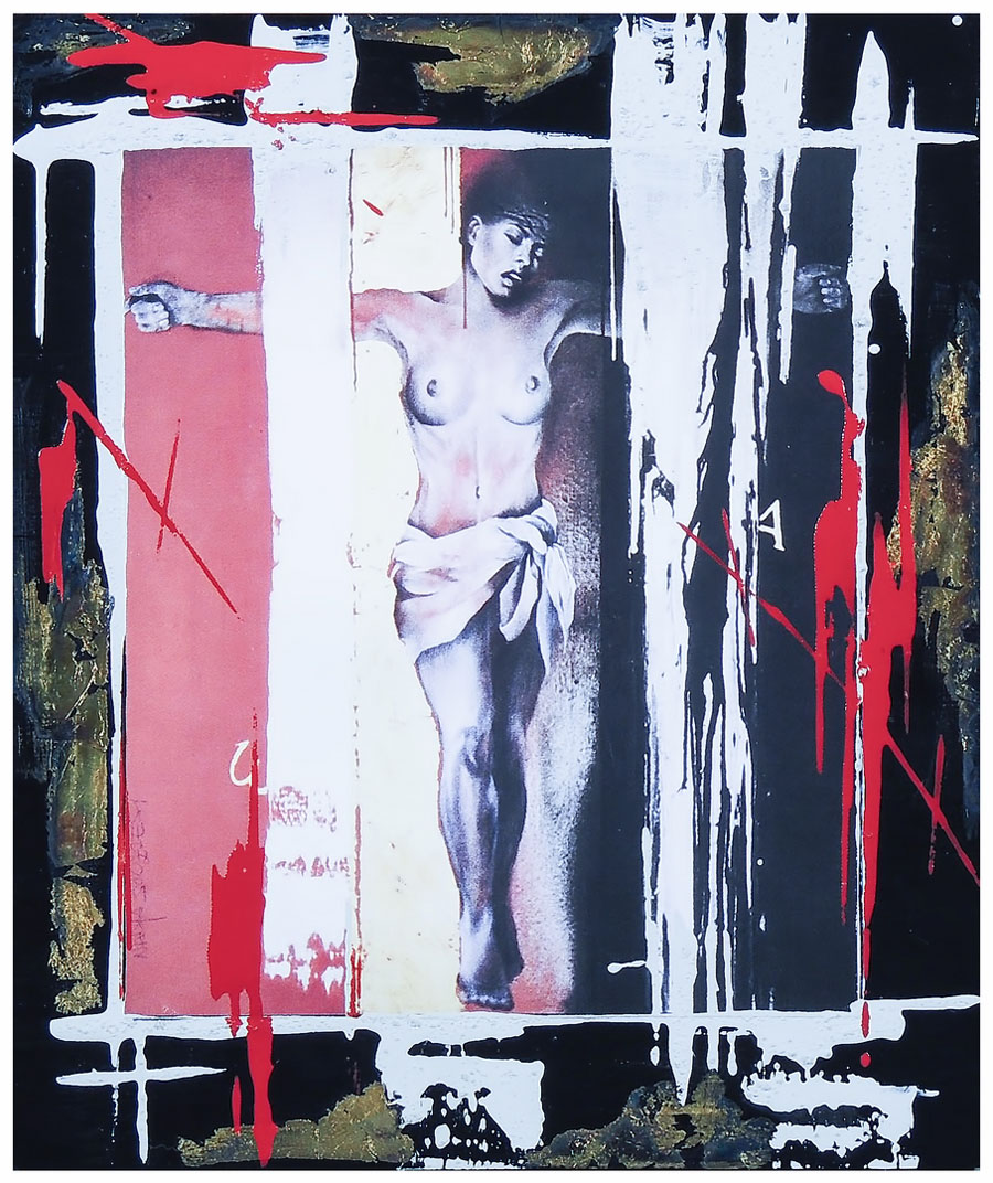 NADIA SCOZZESI Composizione con nudo tecnica mista e stampa su tavoletta, firmato cm 39,5x33 COMPOSITION WITH NUDE, MIXED MEDIA AND PRINT ON PANEL