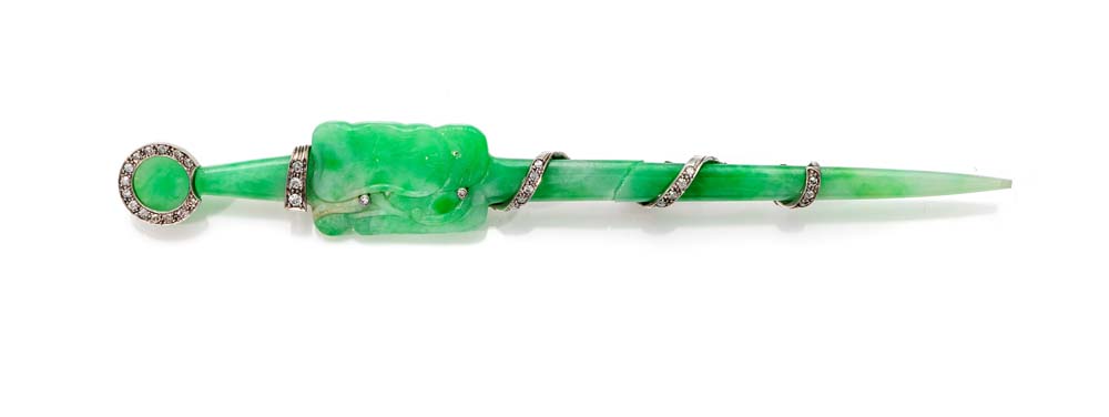 Spillone in oro, giada e diamanti Oro bianco 750/000. Elemento in giada fratturato nella parte centrale. Lunghezza cm 13
