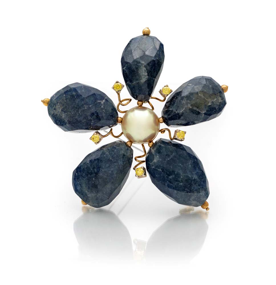 Spilla a fiore in oro giallo, calcedonio blu e quarzi citrini Oro giallo...