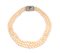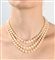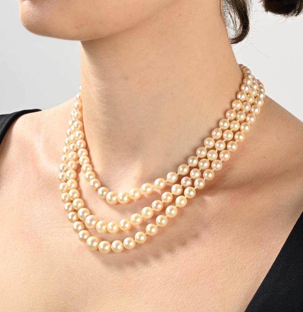 Collana di perle a tre fili con chiusura in oro, diamanti e pietra rossa Oro bianco 750/000. Perle da mm. 5 a mm. 9. cm. 41