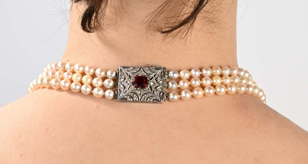 Collana di perle a tre fili con chiusura in oro, diamanti e pietra rossa Oro...