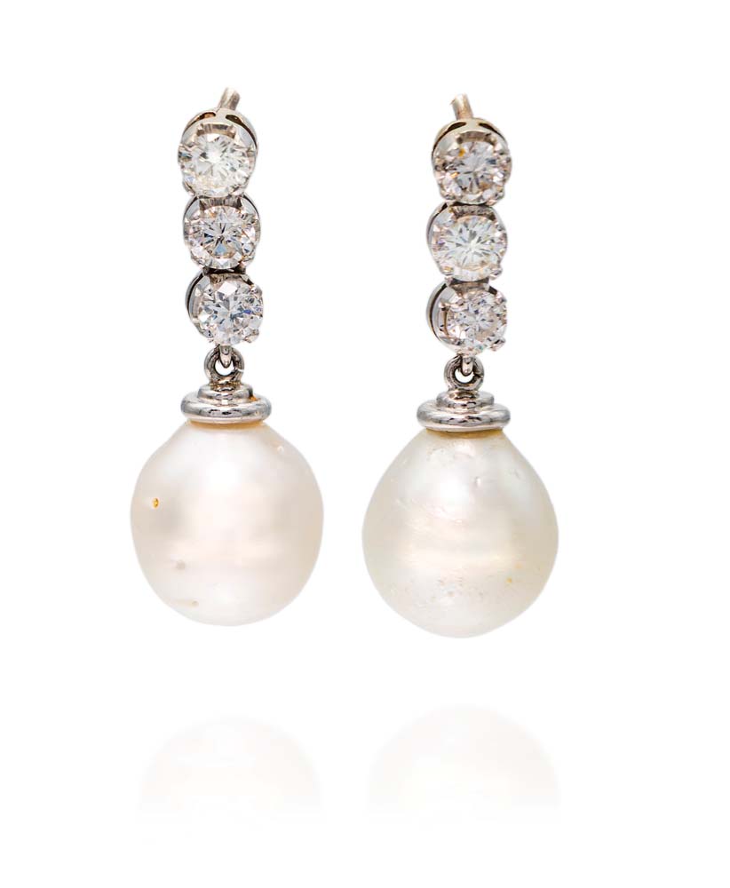 Coppia di orecchini pendenti in oro, perle e brillanti Oro bianco 750/000. Perle South Sea mm 11,5. Diamanti in taglio rotondo brillante ct. 0,60 ca. Peso complessivo gr. 9,4.