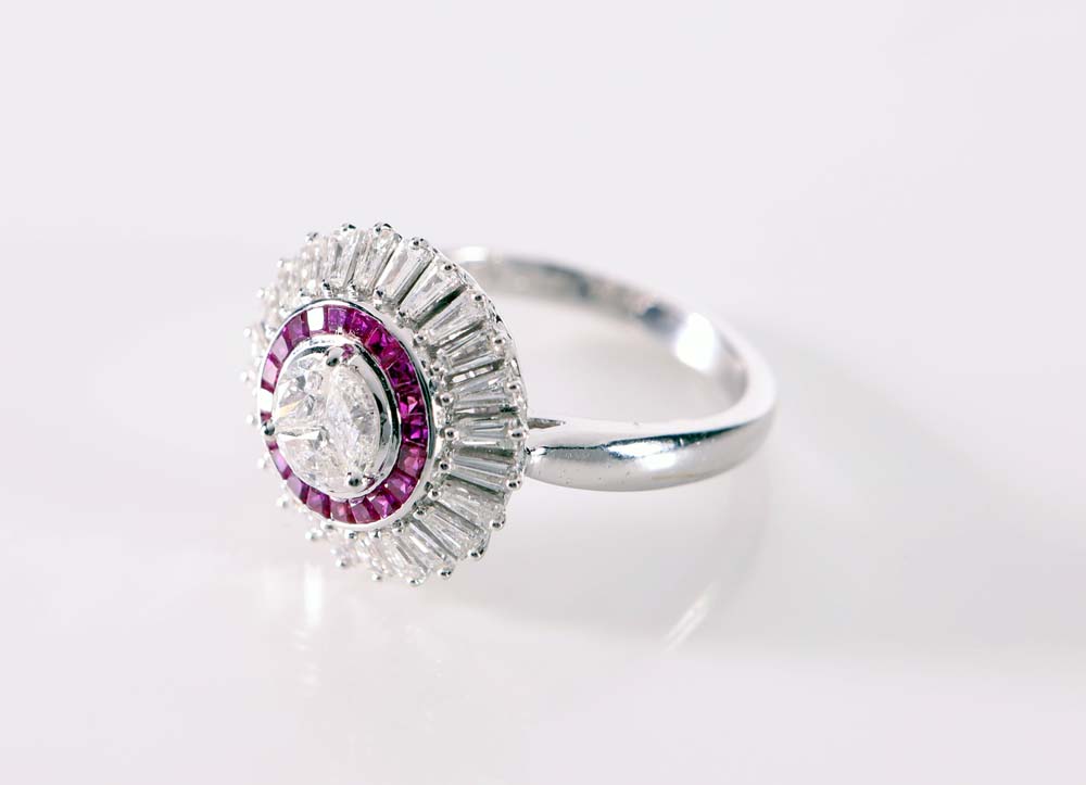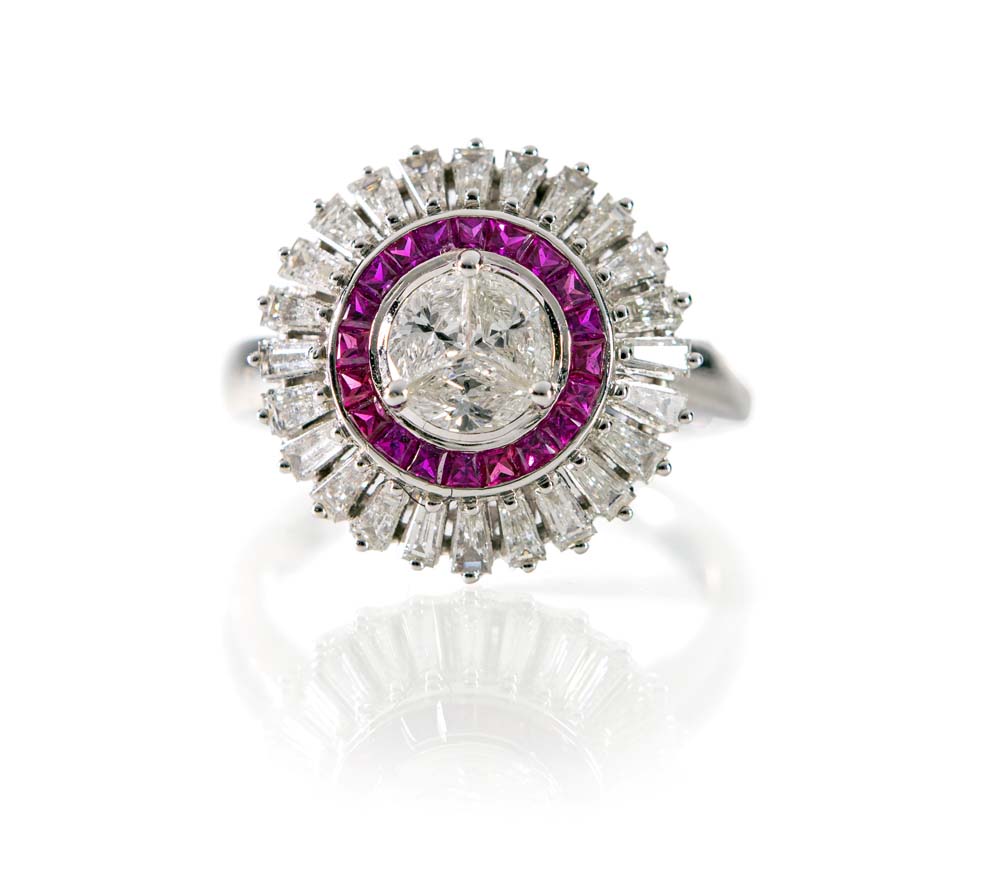 Anello a fiore in oro, diamanti e rubini Oro bianco 750/000. diamanti in...