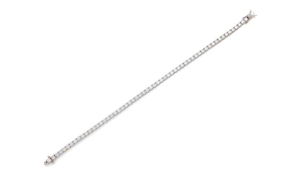 Bracciale tennis in oro e brillanti Oro bianco 750/000. Diamanti in taglio rotondo brillante ct. 3,70ca, prob F -G, VVS. Peso complessivo gr. 9,50. Lunghezza cm 18