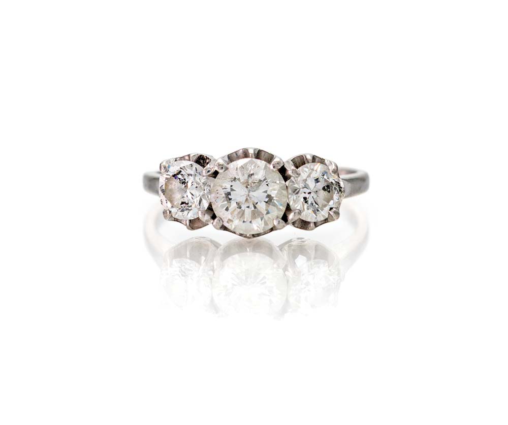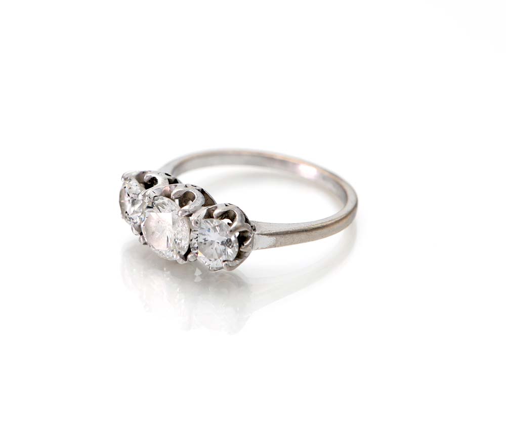 Anello a riviera trilogy in oro e brillanti Oro bianco 750/000. Diamanti in taglio rotondo ct. 1,10 ca, prob. H-I, P1. Peso complessivo gr. 3,40. Misura 12