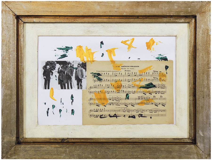 GIUSEPPE CHIARI (1926-2007) Composizione con spartito musicale tecnica mista e collage, firmato, in cornice cm 32x49 Corredata di autentica dell'autore su fotografia COMPOSITION WITH SHEET MUSIC, MIXED MEDIA AND COLLAGE, WITH AUTHOR'S AUTHENTICATION ON PHOTO