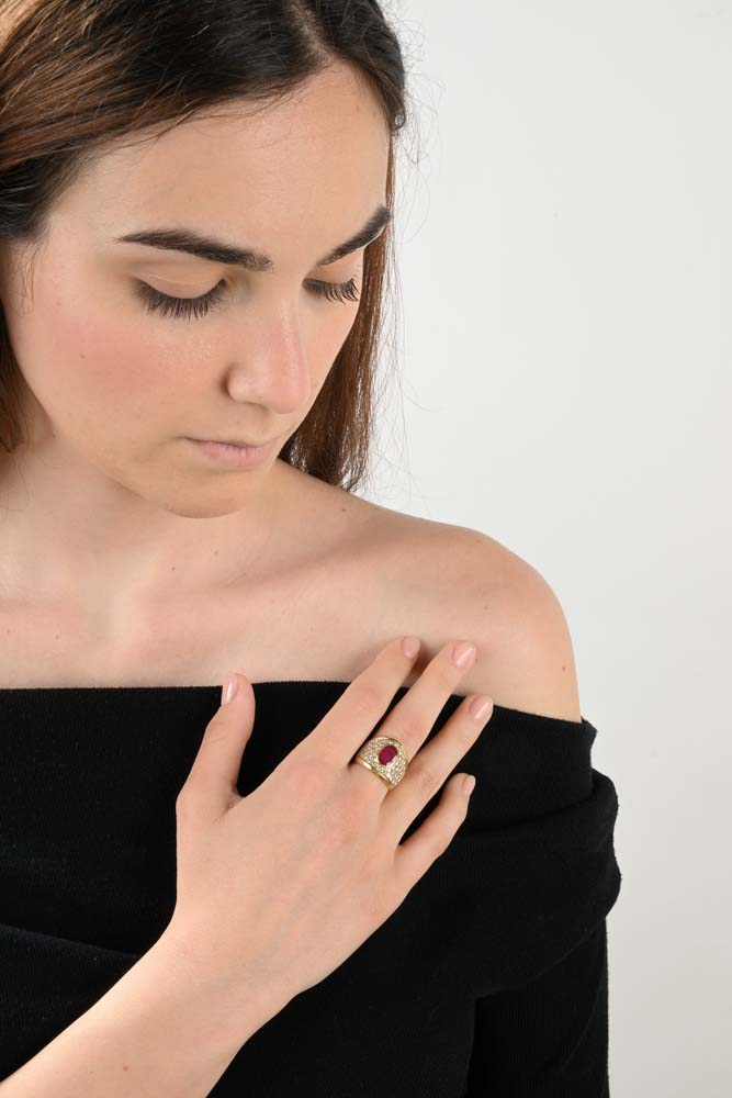 Petochi anello in oro, rubino e brillanti Oro giallo 750/000. Rubino taglio ovale ct. 2,50 ca. Diamanti in taglio rotondo brillanti ct. 1 ca. Peso complessivo gr. 9,60. Misura 12
