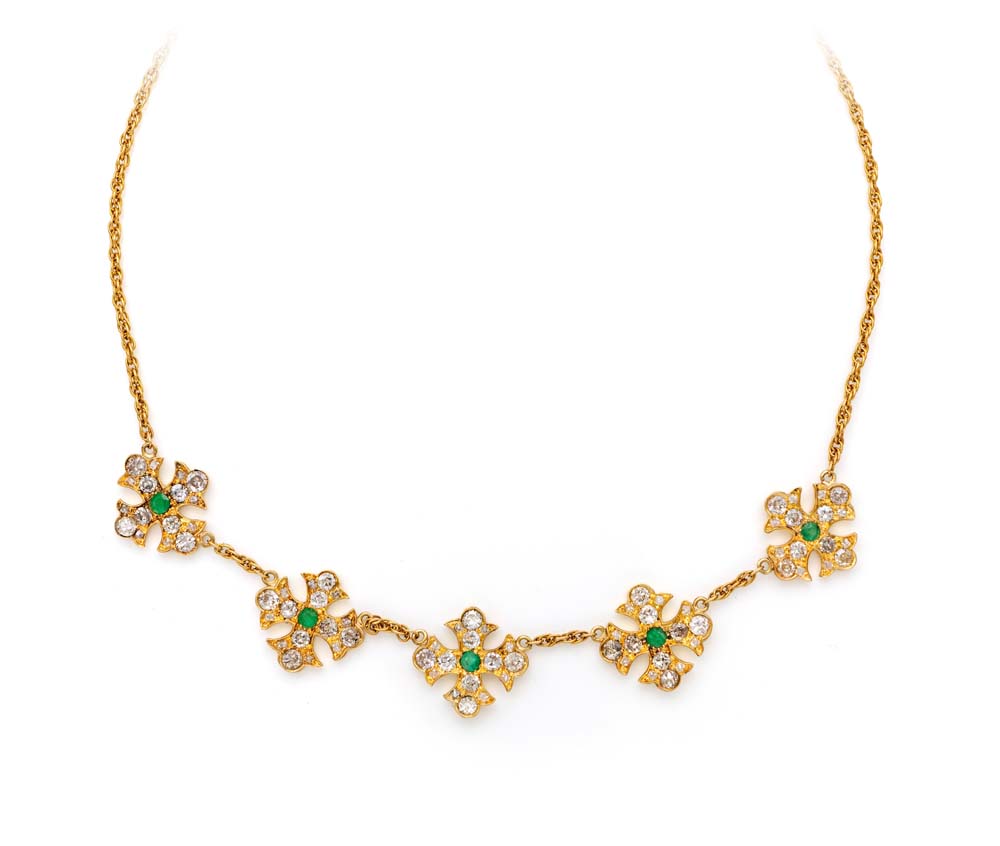 Girocollo in oro, diamanti e smeraldi Oro giallo 750/000. Peso complessivo gr. 15,40. Lunghezza cm 42