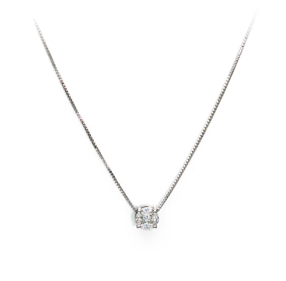Pendente punto luce in oro e diamanti Oro bianco 750/000. Diamanti in taglio navette e carrè. Peso complessivo gr. 2 Lunghezza catena cm 43