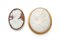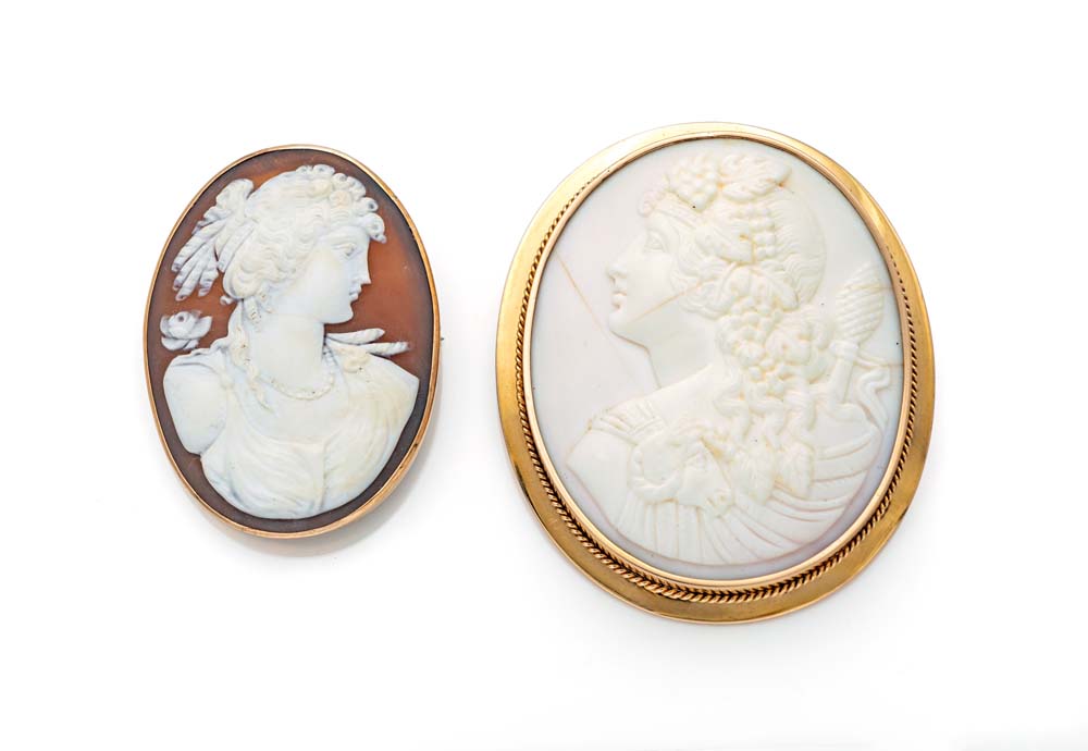 Coppia cammei in conchiglia e oro Oro 585/000. cm 6 x 5 e cm 4,5 x 3,5