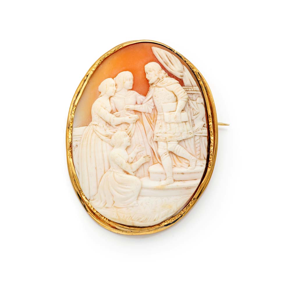Cammeo in conchiglia ed oro Oro 585/000. Raffigurante fine scena d'interno. cm 5,5 x 4 Fine XIX secolo