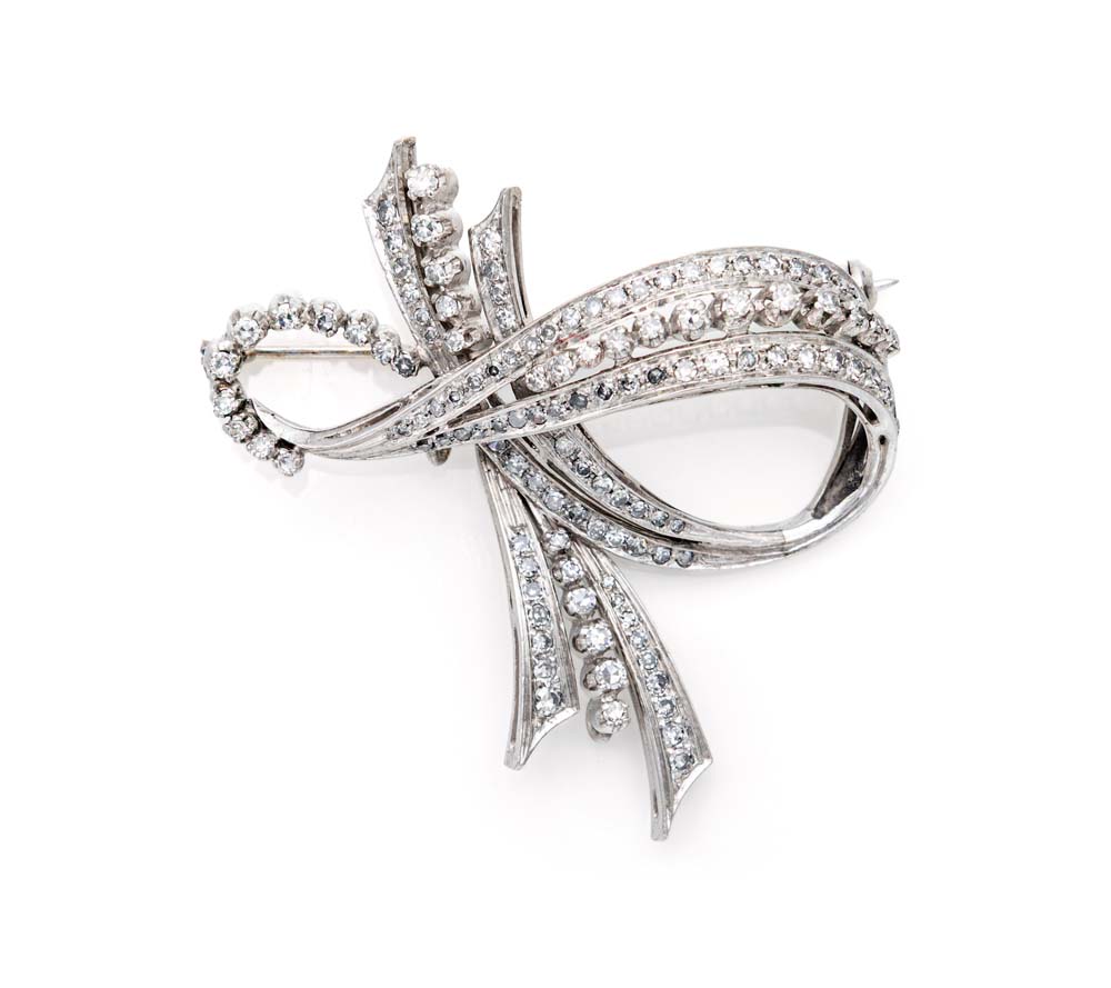 Lot 223 | Spilla in oro e brillanti Oro bianco 750/000. Peso complessivo gr. 14,50. cm...